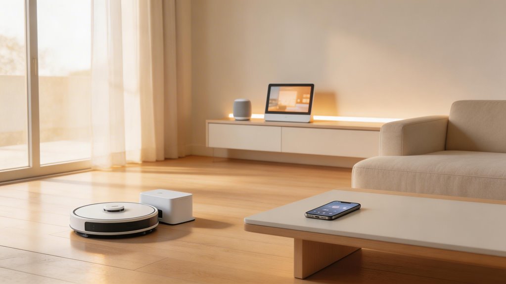 When you connect a robot vacuum to Google Home, you’re getting voice control over the basics—start, stop, pause, maybe send it to its dock. But here’s where it stops. Advanced mapping stays locked in the manufacturer’s app. LiDAR data, obstacle avoidance settings, room labeling, no-go zones—all app-only. Google Home can’t touch them. Your vacuum’s brain works independently from your smart home system. The SLAM technology that enables real-time position tracking and path adjustments happens entirely within the vacuum’s onboard sensors and processing, never transmitting that navigational intelligence to Google Home’s interface. Most robot vacuums can reliably map and store 2–3 floors of your home, with advanced models handling up to 4 or more depending on system memory and capabilities.