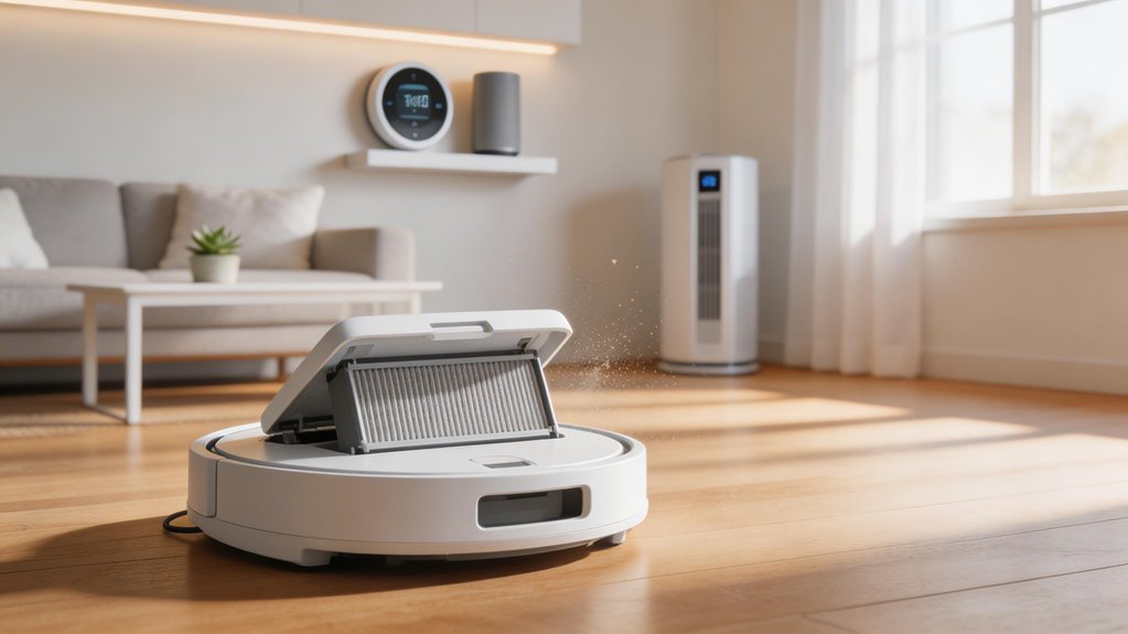 Your robot vacuum’s HEPA filter acts as a guardian against pet odors, trapping odor-causing bacteria and dander. You’ll notice fresher rooms when you combine HEPA with carbon filters, though you shouldn’t vacuum liquid waste directly.